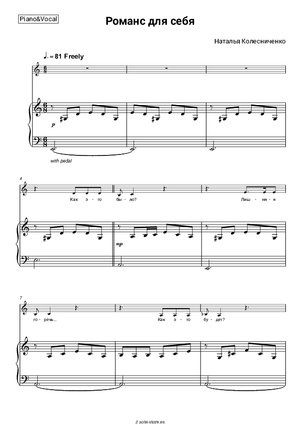 Piano&Vocal partitura escrita para la canción Романс для себя interpretada por Natalia Kolesnichenko. El género de esta obra es Canción de autor, partituras escritas por profesionales de su oficio, interpretadas con un alto nivel de calidad. Dichas partituras pueden aprenderse utilizando tanto Piano, Vocal como voz. Piano&Vocal arrangement costs €11.70, sheet music is available in PDF and MIDI formats.